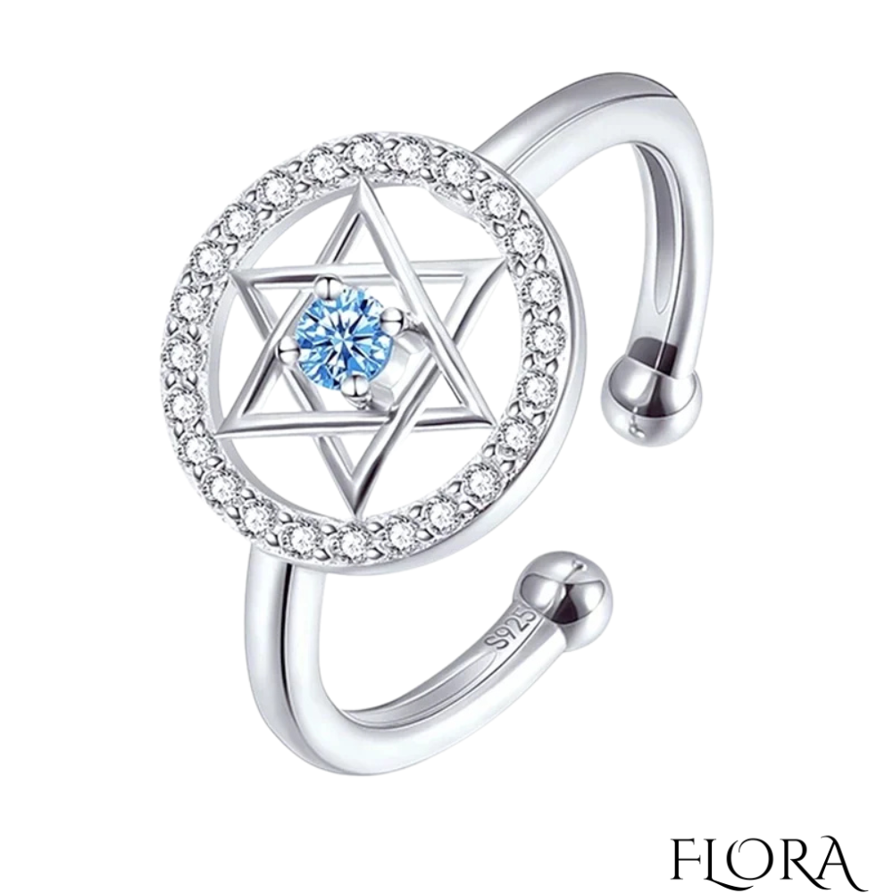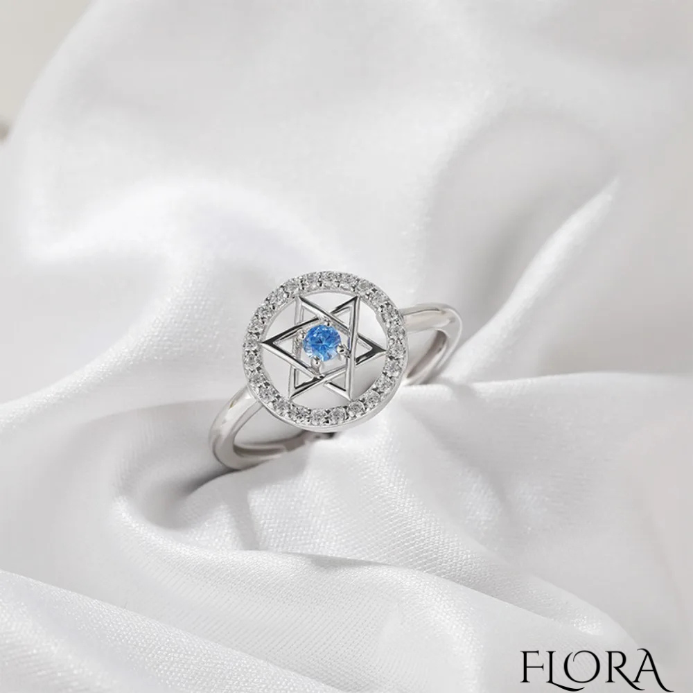 טבעת כסף אמיתי עם מגן דוד במרכז, מעוטרת בזירקון כחול שמסמל הגנה ורוגע פנימי.