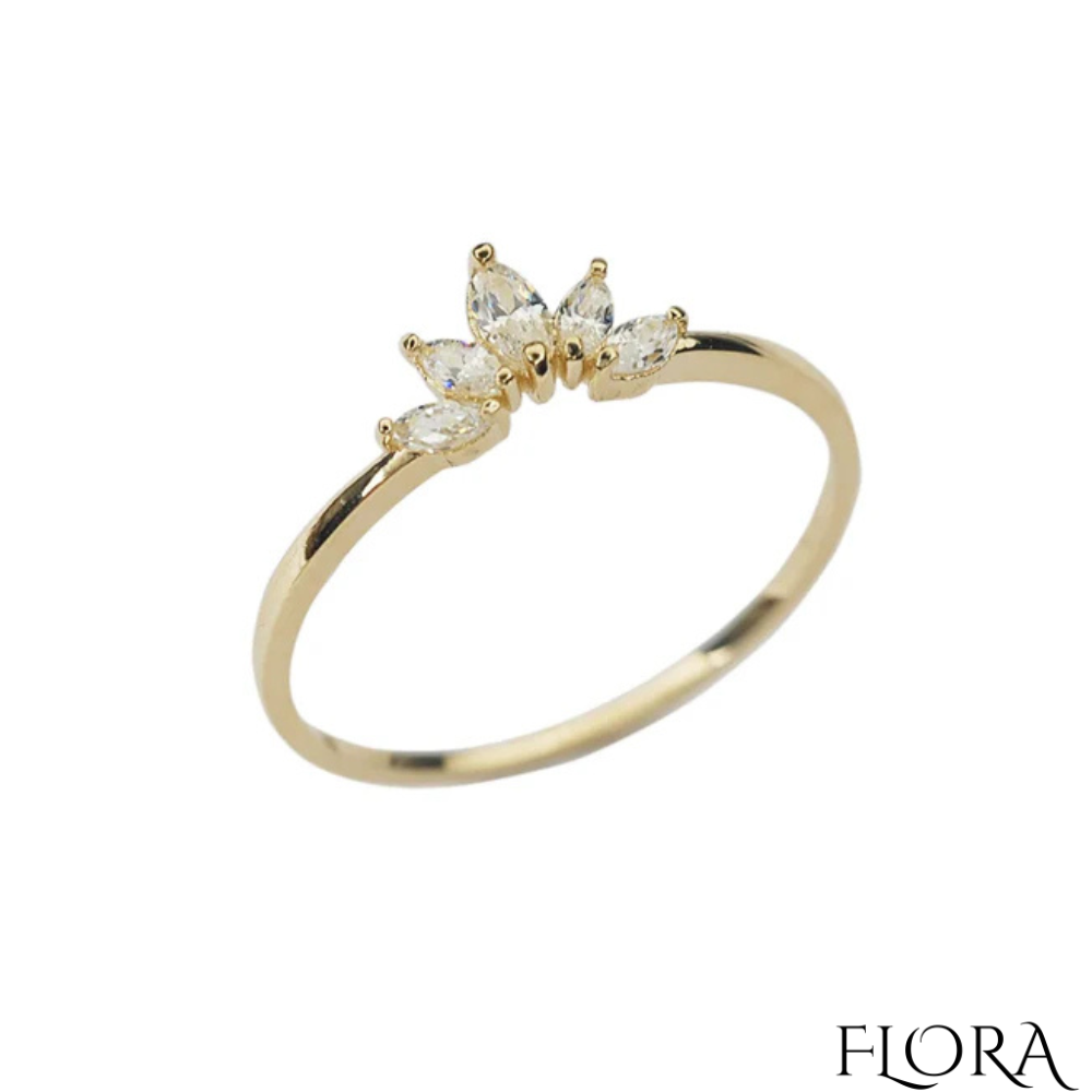 טבעת בעיצוב כתר עדין ומרהיב, עשויה מציפוי זהב 14K ומעוטרת באבני זירקון מבריקות.