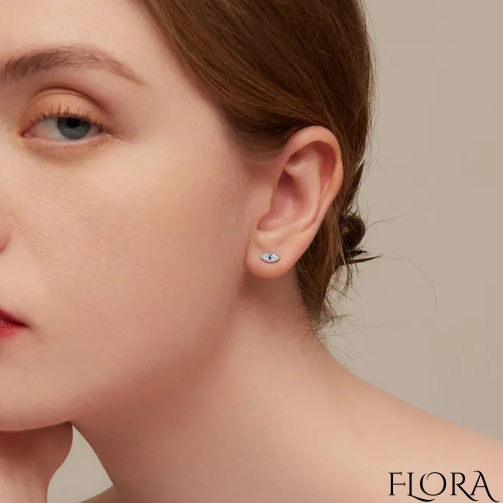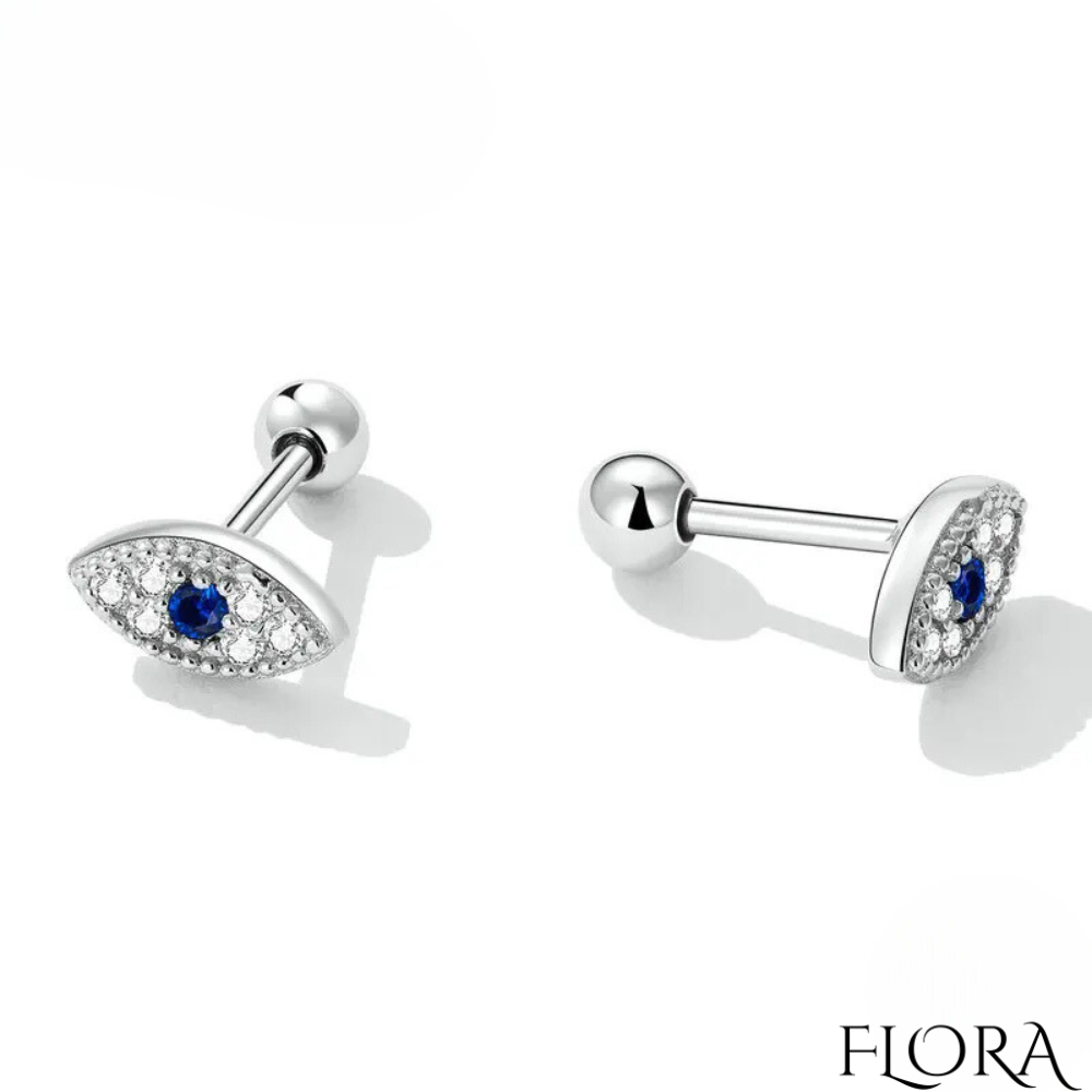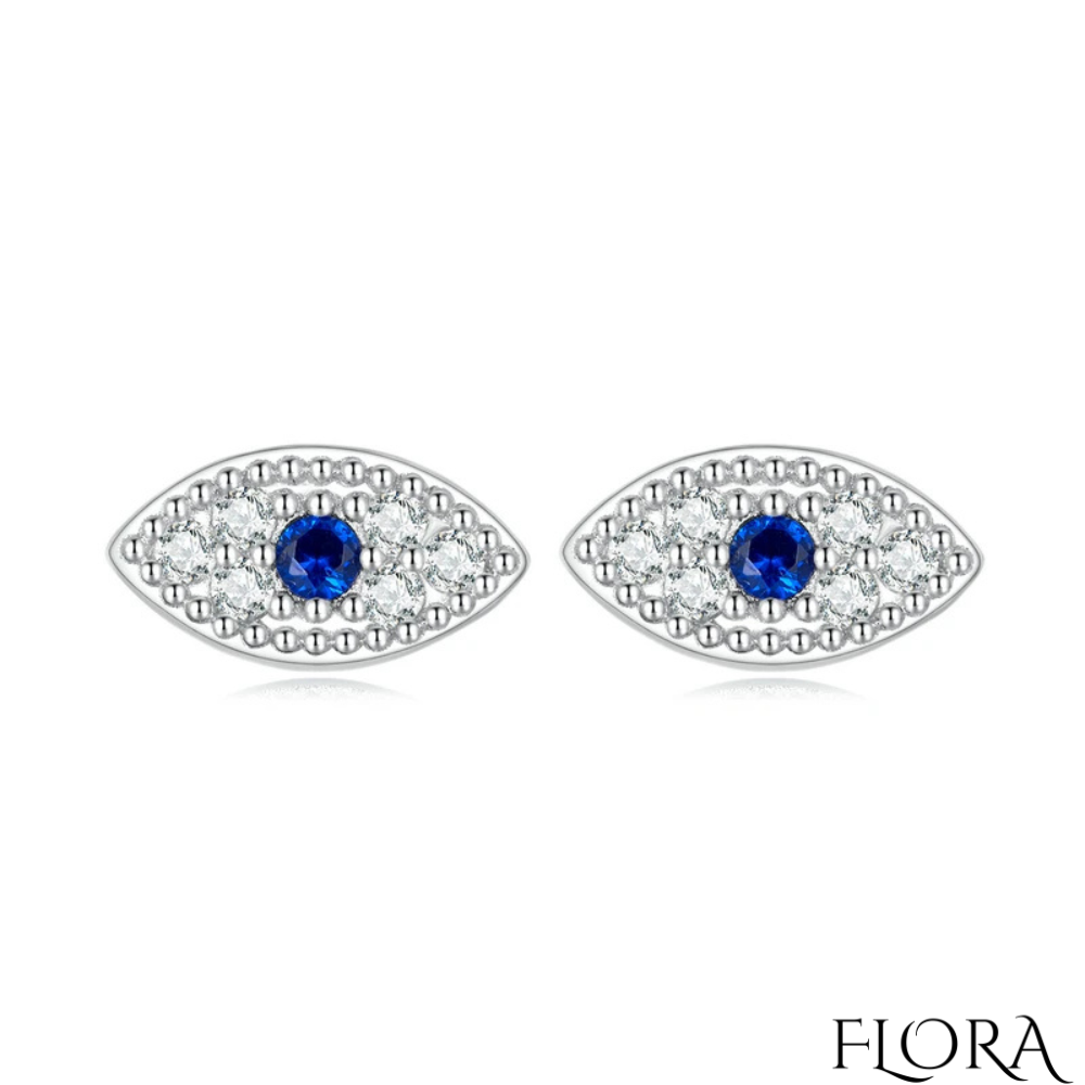 עגילי כסף 925 מלווים באבני הזירקון היוקרתיות בעיצוב ייחודי של עין הרע, המשלבים בין סמל עתיק למראה מודרני.